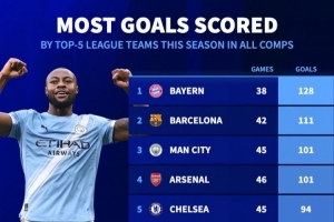 体育资讯3月9日讯 德国转会市场统计了五大联赛球队本赛季各赛事的进球数量,并列出榜单,拜仁128球居首,巴萨111球次席。