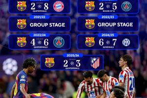 2025-26赛季,巴萨总比分2-3不敌马竞,无缘欧冠4强。